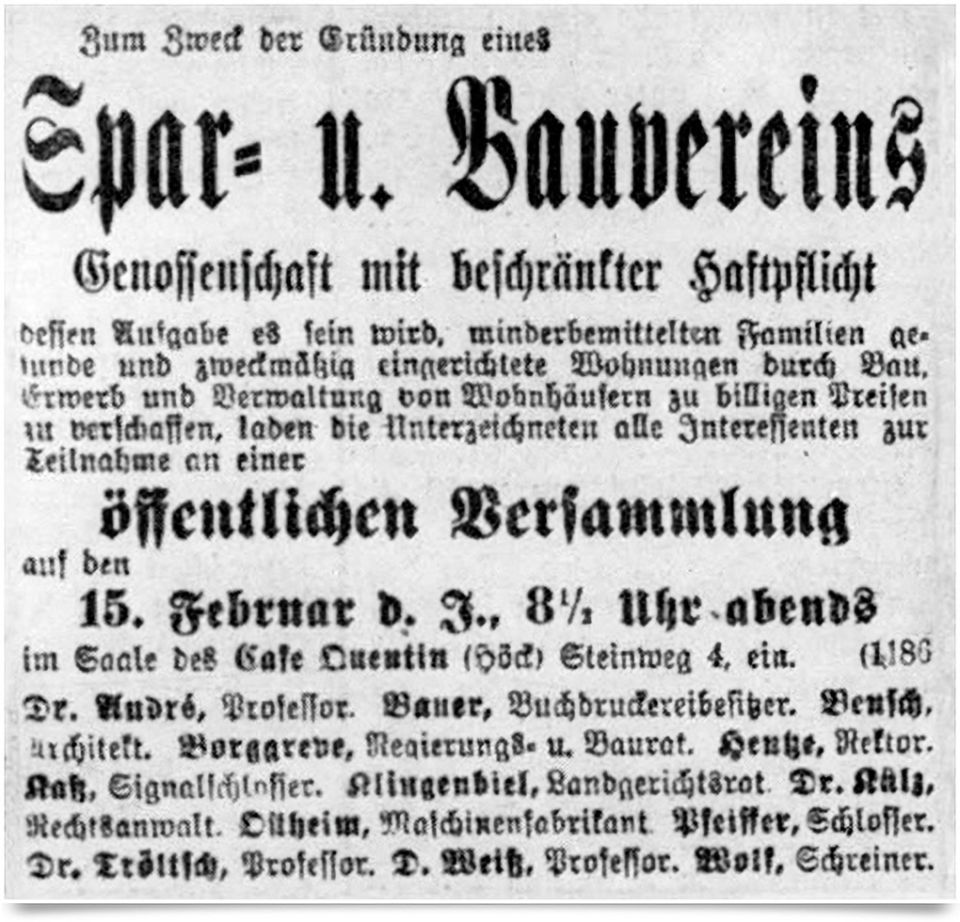 Am 12. Februar 1907 erschien in zwei Marburger Tageszeitungen ein Aufruf „zum Zweck der Gründung eines Spar- und Bauvereins, dessen Aufgabe es sein wird, minderbemittelten Familien zweckmäßig eingerichtete Wohnungen zu billigen Preisen zu verschaffen".